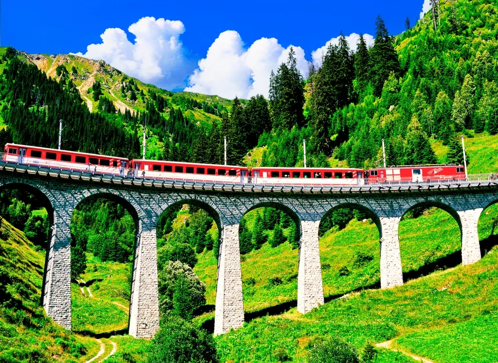 This iconic route travels across the heart of the Swiss Alps, connecting the glamorous resort towns of Zermatt and St. Moritz. Over eight leisurely hours, the train glides through deep valleys, over dramatic gorges, and across 291 bridges, with huge viewing windows giving you front-row seats to snow-capped peaks, pine-covered hills, and storybook villages.